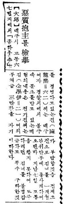 [Daegu] Jin Yong-hui, who operates a "whore house" at No. 67 Kyo-dong in Daegu City, has been brought in for questioning, without detention, at the Daegu Women's Police Station. Ms. Jin is charged with previously telling 21-year-old Kim Hak-i (金學伊) that she would pay her debt of 30,000 hwan if she would work for one month as a comfort woman, but when Ms. Kim could no longer endure the suffering and tried to escape on the 7th, she was illegally confined and beaten numerous times.
