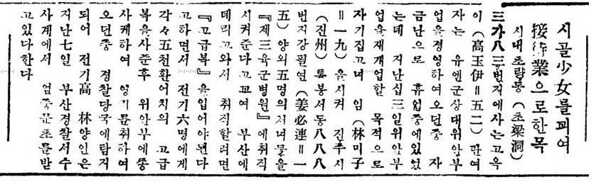 Go Ok-i (高玉伊), a 53-year-old woman who lives at No. 83 on 3rd Street in the Cho Ryang-dong area of Hanmok City, was operating a comfort woman business for UN servicemen until she suspended operations because of financial difficulties. Then on the 3rd of this month, with the intention of reopenning her business, Ms. Go had her maid, Im Mi-ja (林미子), lure five virgins, including 15-year-old Gang Pil-yeon (姜必連) of Jinju City (at No. 888 in Tongbong-dong), to Busan with promises of getting them jobs in the 34th Military Hospital.